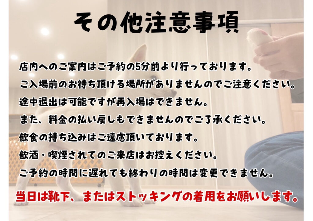 リボンやボタン、紐などを噛んで遊ぼうとする子がいるので 極力避けてご来店くださると助かります🙇♀️ (2025年7月追記) 飲食の提供はありません。 お飲み物をご希望の方は 入場料+100円でお付けできます。 ふれあいには お家のわんこは連れてこないでください🙇♀️