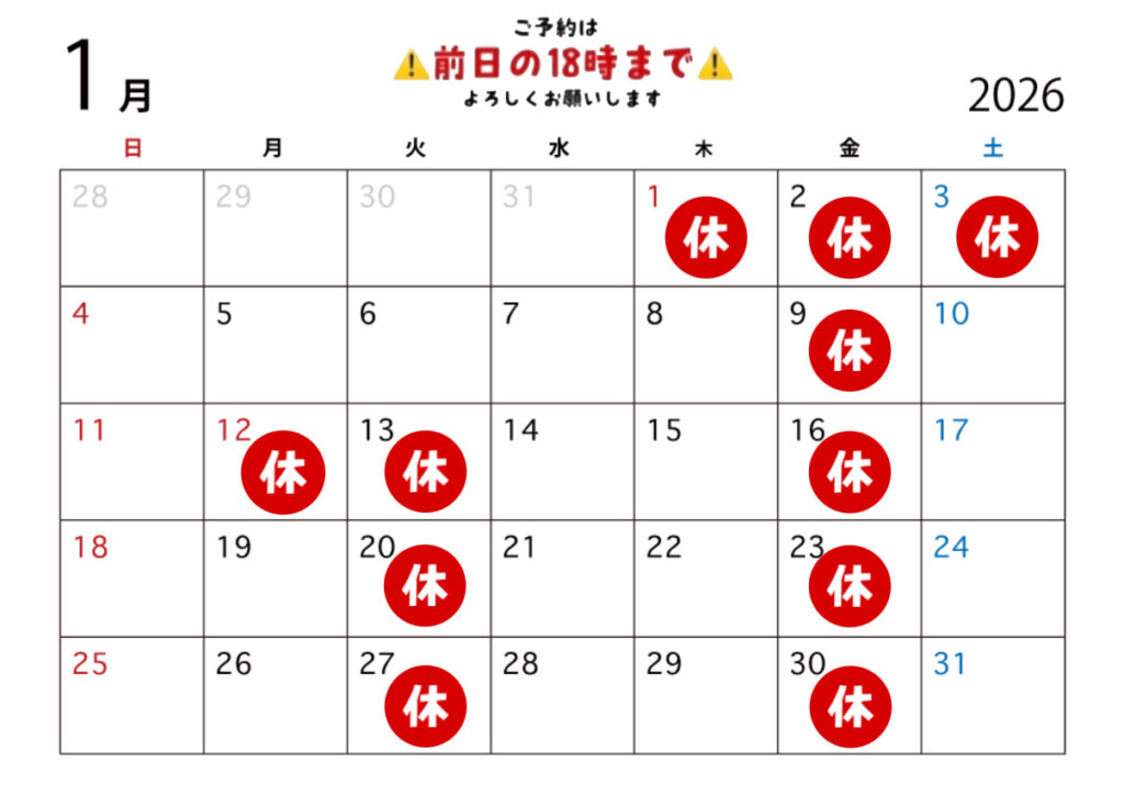 2025.12.17 未分類 2026年1月営業日 kana_9802@icloud.com 2026年1月営業日のお知らせです。 年末年始は2025年12月30日~2026年1月3日までお休みを頂きます。1月12日は申し訳ありませんがお休みを頂きます🙇♀️来年もはなちゃん家をよろしくお願いいたします! ABOUT ME